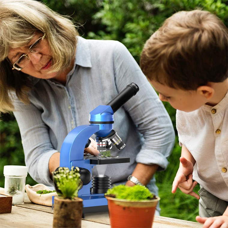High Magnification microscope built-in WF10x & WF25x eyepiece and optical lens: 4x, 10x, 40x , rotatable monocular head offers six magnification levels at 40x, 100x, 250x, 400x and 1000x. High Quality Optics can give children improved visual quality and sharp image when in use Dual Light Illumination Double light compound microscope has incident and transmitted light sources, which can see both opaque objects illuminated from above and translucent specimens illuminated from below. the bottom light can be adjusting light by rotrating the wheel as you needed, easy to use.(Not including batteries)
